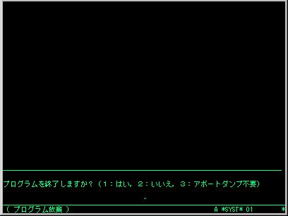 「プログラム放棄コマンド」を実行すると以下の画面になります。終了する場合は「1:はい」か「3:アボートダンプ不要」を選択します。「1:はい」の場合はアボートダンプを採取する画面になります。やっぱり終了しませんという場合は「2:いいえ」を選択します。