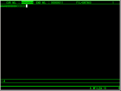 コマンド入力部で「4」と入力し、「ENTER」キーを押します。すると4レコード目がレコード表示部に表示され、カーソルがレコード表示部に移動します。