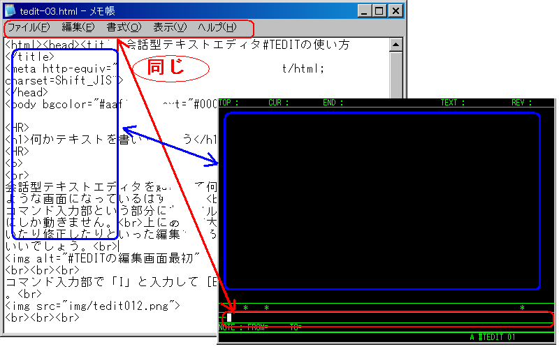 会話型テキストエディタ#TEDITのコマンド入力部は、Windowsのメモ帳のメニュー(ファイル(F)、編集(E)と書いてある部分)に相当します。